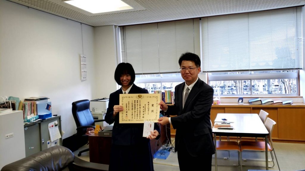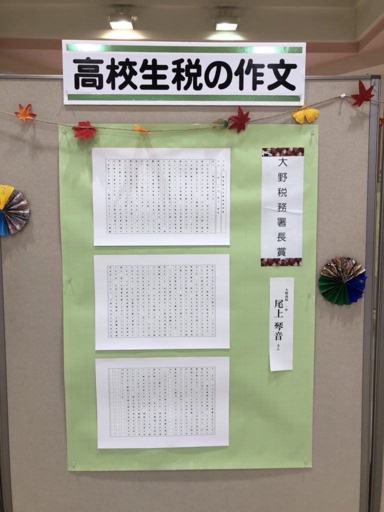 1年生の尾上さんが「税に関する作文」で大野税務署長賞を受賞しました。