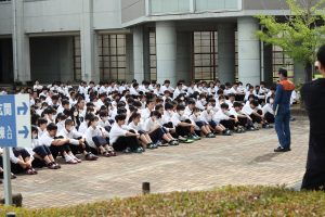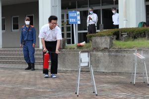 講評をいただいた後、3年生各クラス1名が代表して消火器を使った消火体験をしました。