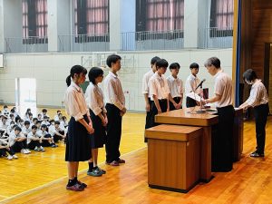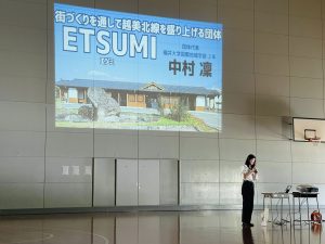 同時に一学期後半に活躍した部活動の伝達表彰があり、終了後、本校卒業生の中村凛さんより、ETSUMI(まちづくりを通して越美北線を盛り上げる会)への参加募集のプレゼンテーションがありました。