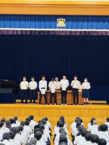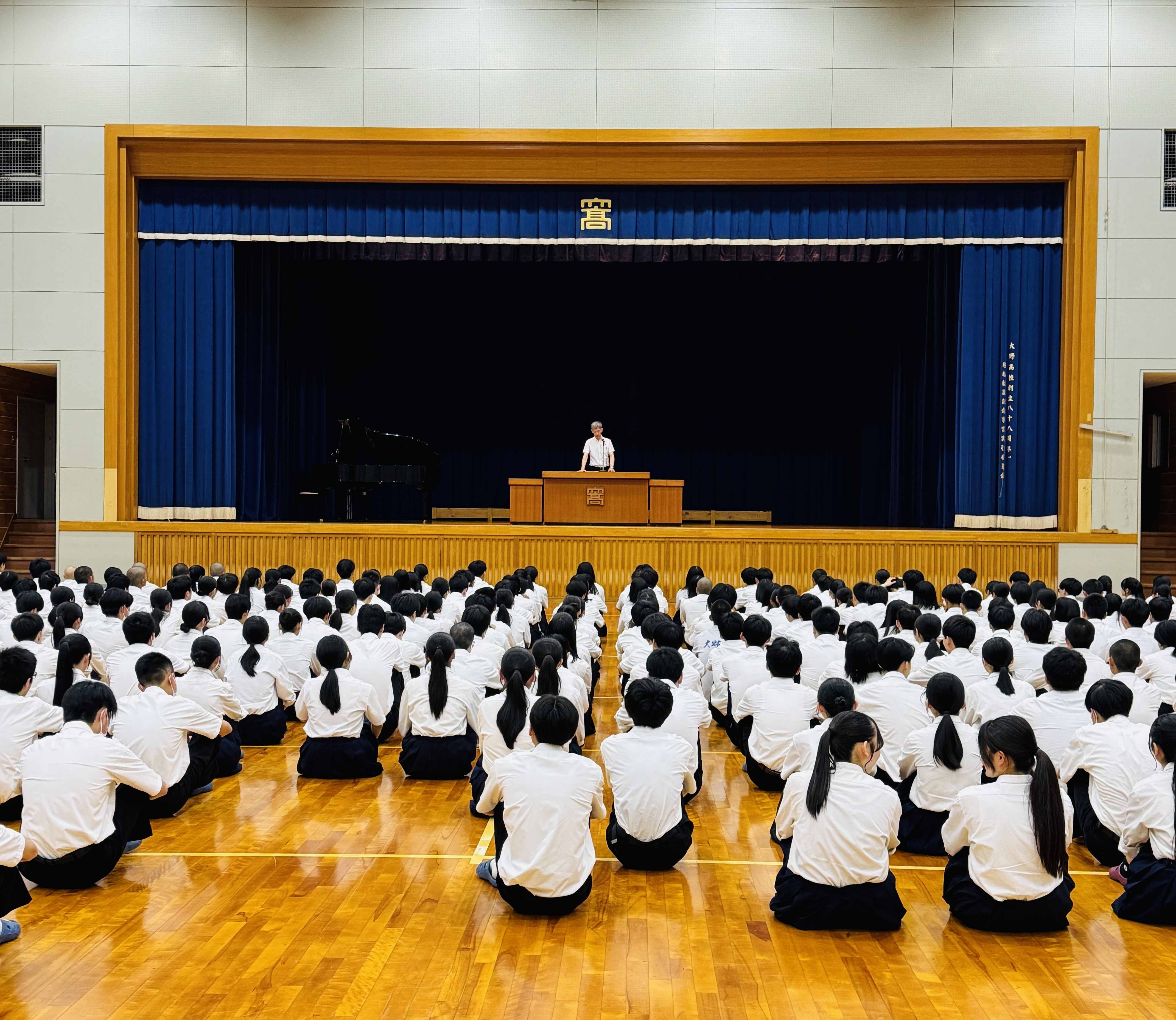 7月18日、一学期の終業式が行われました。校長先生からの式辞では読書の魅力と重要性についてのお話がありました。活躍した男子バレーボール部、卓球部、男子バスケットボール部、柔道、JRC「結」の伝達表彰も行われました。