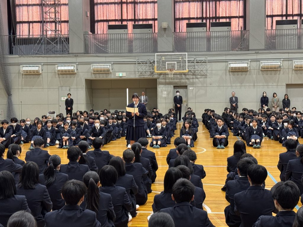 4月8日、令和8年度新任式・始業式・対面式が行われました。新たに12名の教職員の方々をお迎えし、1年生も加わり、大高の1年が始まりました。新入生代表挨拶では、「この3年間で、自分で考え行動し、責任を持つことの大切さを学びながら多くのことを学び、成長できるよう努力していきます」との言葉がありました。