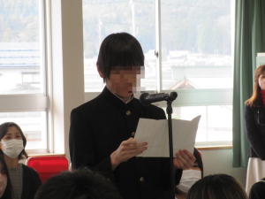 生徒数名から「能登半島地震で被災された方々に、自分たちのできることはないか」という申し出があり、生徒会が中心となり、お昼休みを中心を募金活動を行いました。集まった募金は19日(金)に生徒会の代表が日本赤十字社大野市支部へお渡ししました。